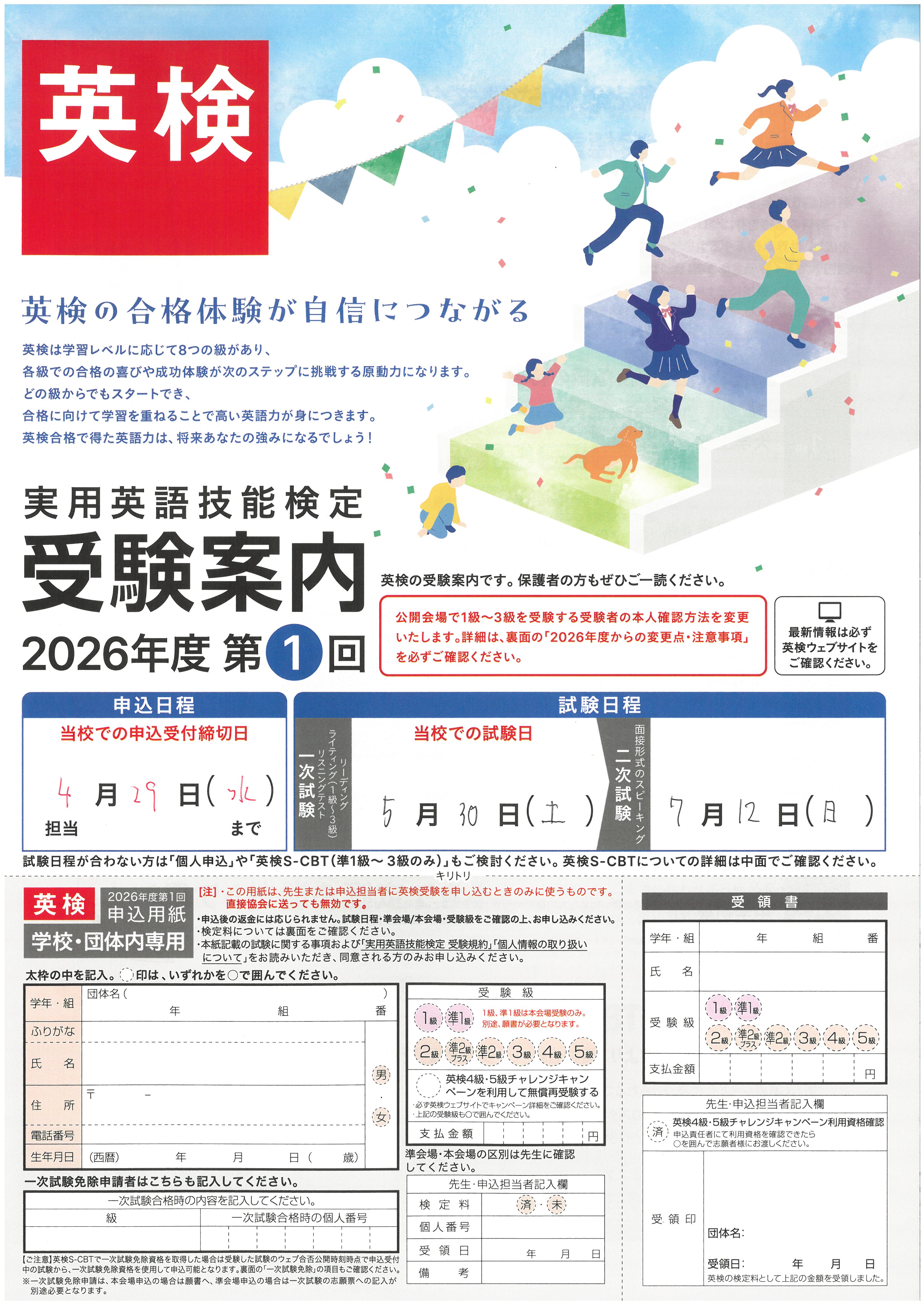 2026年度第1回英検(一次試験)は 5月30日(土)に実施します。開始時間は未定(15時以降に実施予定)です。申し込みの受付は 4月29日(水)まで。なお、二次試験は 7月12日(日)で本会場受験となります。